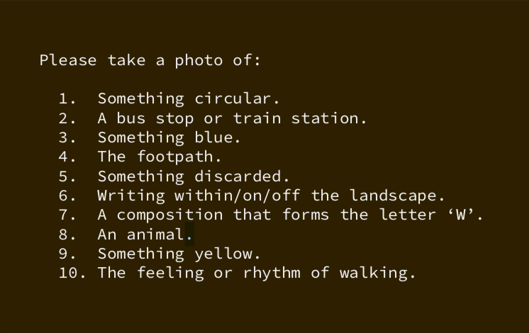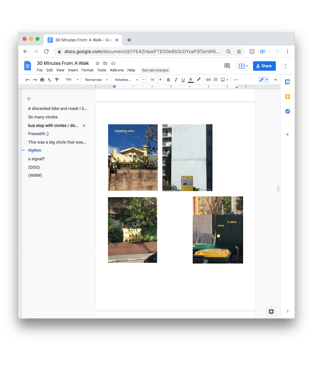 Fascilitated by Temporary Position, I curated a collaborative walking guide to engage the public with their surroundings and each other. The event was interrupted by Sydney’s 2021 lockdown due to the Covid-19 pandemic. In this context, the audio guide and the shared Google doc became a way of sharing time with others when physical proximity was discouraged. We walked together but seperate through our locked-down landscape, connected by the same voice in our headphones. It gave an opportunity to escape our isolation for 30 minutes.
